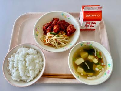 今日の給食は、ごはん、牛乳、ヤンニョムチキン、もやしのナムル、青菜のスープです。『ヤンニョムチキン』は、香辛料など使っていないのに、本格的な味です。調理員さんの工夫です。