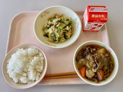 今日の給食は、ごはん、牛乳、肉じゃが、うす揚げ入り小松菜のごま和えの『省塩献立』です。いつもですが、出汁をしっかりととったり、野菜を十分煮込んだりしているおかげで、『省塩』とは思えない『コク』があります。
