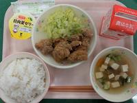 今日のメニューは、から揚げ・豆腐としめじのスープ・ひゅうがなつゼリー。