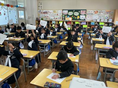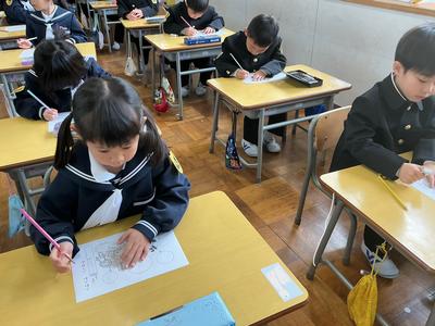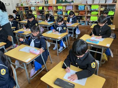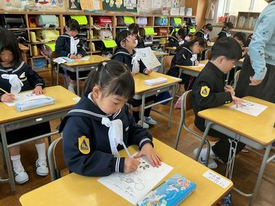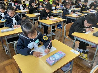 文字の書き方の練習に取り組みました。「足ぺったん、背筋ピン」と良い姿勢を意識しながら、点線で描かれた風船の形を、はみ出さないように一つ一つ丁寧になぞっていました。真剣な表情から、「きれいに書こう」という気持ちが伝わってきました。