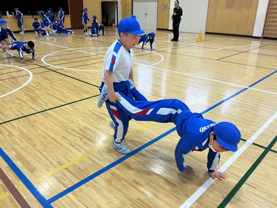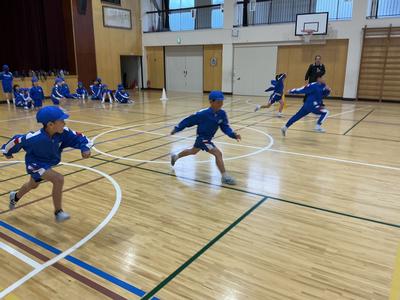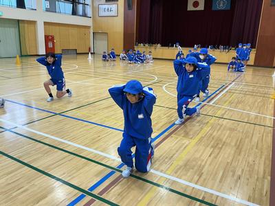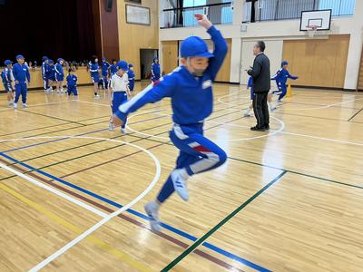 体育の時間に、陸上運動につながる様々な動きを取り入れたウォーミングアップをしました。片足でリズミカルに前へ進むジャンプや、高く跳び上がる動きなど、体の使い方を意識しながら活動しました。ペアで手押し車にも挑戦し、声をかけ合いながら楽しむ様子も見られました。