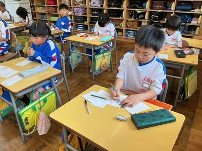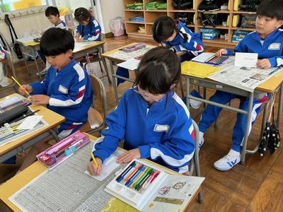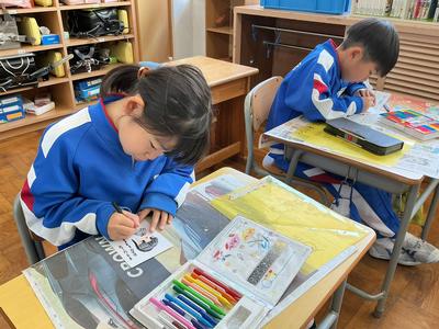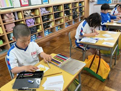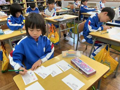 生活科の学習で「1年生と仲良くなろう会」を計画しています。今日は、その時に1年生にプレゼントする名刺を作っていました。自分の名前や好きな絵、1年生へのメッセージなど、心を込めて一枚一枚丁寧に作る姿がとても微笑ましかったです。きっと、1年生も喜んでくれますよ。