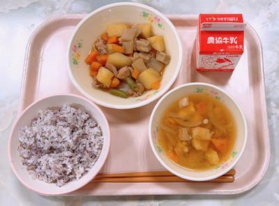 今日の給食は、「ゆかりごはん、ぎゅうにゅう、とりにくのさっぱりに、たまねぎのみそしる」です。今日もたくさんの具材で栄養たっぷりです。