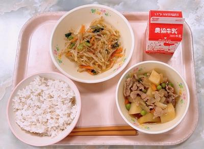 今日のメニューは、「むぎごはん、ぎゅうにゅう、にくじゃが、もやしのごまずあえ」でした。省塩献立(塩分少なめ)でしたが、肉の旨味や野菜の甘み、シャキシャキ感が感じられ、おいしく味わいました。