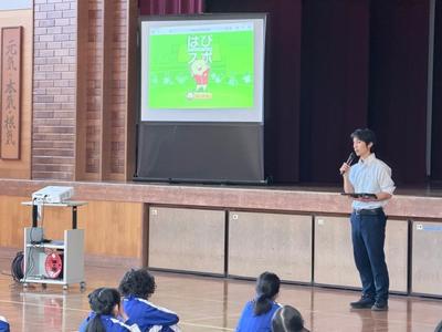 その後、「はぴスポ」について説明がありました。これから「みんなで走ろう」「みんなでとぼう」について、タブレットを使って「はぴスポ」に記録していきます。初めての1年生には、6年生が教えてくれるそうです。