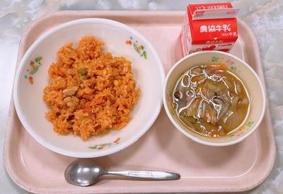 今日のメニューは「チキンライス、ぎゅうにゅう、やさいスープ」です。「入学・進級お祝い献立」です。