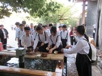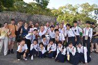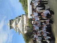 大きなお堀の周りをずいぶん歩いて大阪城に着きました。歩いている時は、すれ違う修学旅行生や外国の方にあいさつを元気よくしていてびっくりしました。相手方も皆さんあいさつを返してくれ、楽しい道中となりました。外国の方の団体と会話をして一緒に写真も撮りました。大阪城はとてもきれいでした。8階まで歩いて登り、大阪の町を一望したり、中の展示内容を見て回ったりして楽しそうでした。