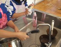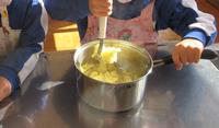 さつまいもをゆでてつぶし、材料を混ぜました。