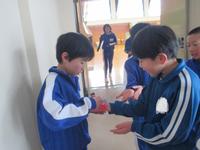 1月15日(木)~28日(水)の2週間、大休みや昼休みの終わりに、体育館の出入口に保健委員の当番が立ち、「手洗い練習用スタンプ」を押して、石鹸を使った30秒間の丁寧な手洗いを呼び掛けました。スタンプのインクが落ちるまで、手洗いをきちんとできた人には、名簿にシールを貼ることができます。期間中、手洗いをきちんとして、シールを貼れていた人には、保健委員から賞品を送る予定です。