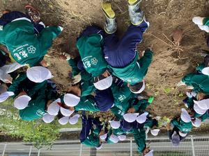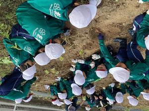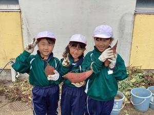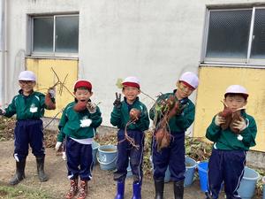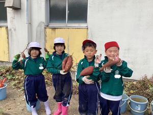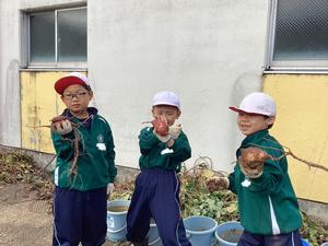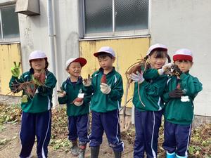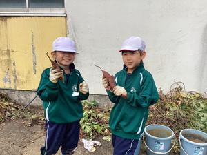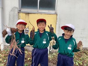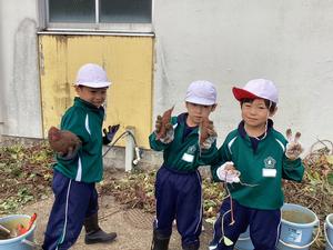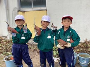 春に植えたさつまいも。とうとう収穫の日がきました。長靴をはいて準備万端。たくさんのさつまいもに大喜びでした。さつまいもを持って写真も撮りました。