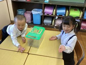 校庭で生きもの探しをしました。バッタ、トンボ、コオロギ、ダンゴムシなど、いろいろな生きものを見つけることができました。触ったり、観察をしたりしました。