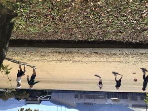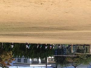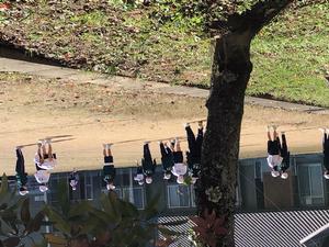 今日は、青空が広がり、良い天気です。校庭では、たくさんの子供たちが、学年に関係なく一緒に仲良く遊んでいました。明日は、マラソン大会です。明日も晴れそうです。
