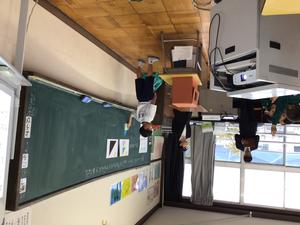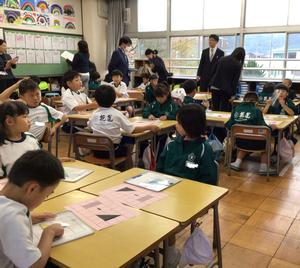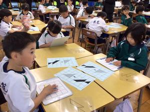 市の指導主事の先生方に授業をみていただきました。1年生の算数「かたちづくり」の授業では、色板を動かして、鍵穴の形を作る活動に取り組みました。一人一人が、宝箱の鍵穴の形を作ろうと色板を動かして、グループのみんなに説明をしていました。説明を聞いている子も、自分と同じ考え方か、付け足すことはないかなど考えながら聞いていました。
