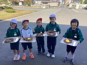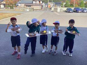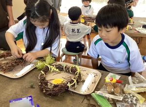 アサガオのつるでリースを作りました。支柱からつるを外したり、形を整えたりするのが難しかったですが、一生懸命頑張っていました。また、つるに飾り付けもしました。どんぐりや落ち葉をつけたり、毛糸を巻き付けたりして、世界に一つだけのリースが出来上がりました。とても可愛いリースができて、嬉しそうでした。