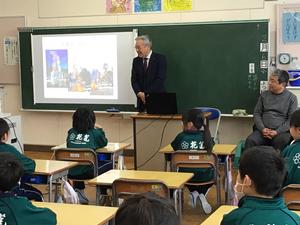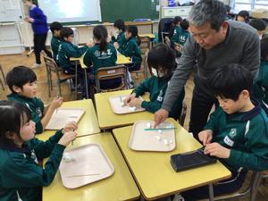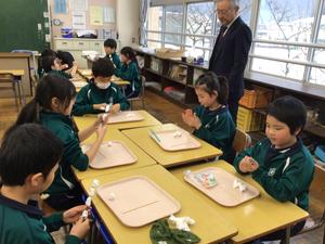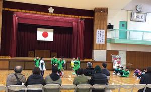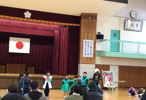 花筐地区の伝統的な行事「蓬莱祀」について、岡太神社の総代 岩坂昭宏さんと蓬莱祀保存会 佐々木昇さんから詳しく教えていただきました。お話をお聞きした後、繭玉作りの模擬体験をし、山車の模型に飾り付けをしました。そして、子供たちによる劇「おおとの皇子と蓬莱祀」を発表し、みんなで山車を引きました。子供たちは楽しみながら、ふるさとの歴史を学ぶことができました。