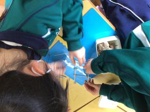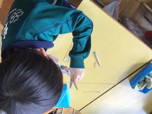「はこの形」の授業では、竹ひごと粘土を使って、はこの形を表しました。何センチの竹ひごが何本いるか、粘土は何個いるかを話し合った後、グループで協力して作り、はこの形への理解を深めました。