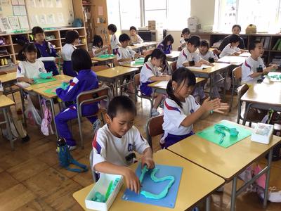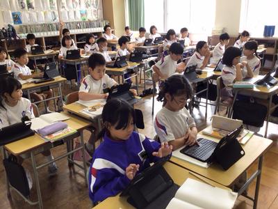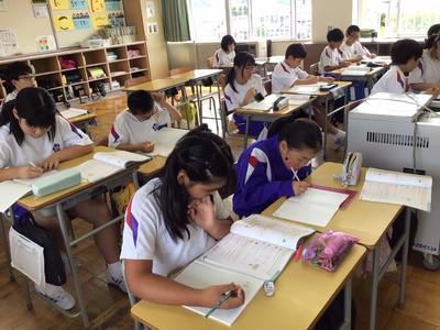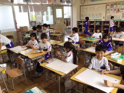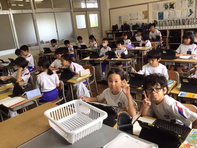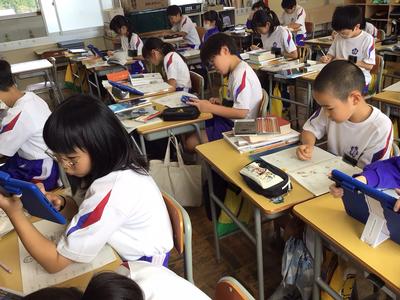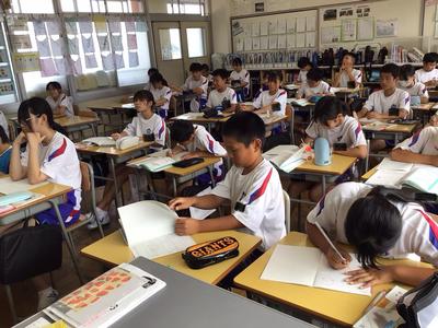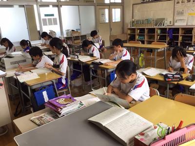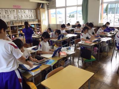 3時間目の各学年の様子です。1年生 図工、2年生 体育、3・4年生 社会、5・6年生 算数の時間でした。今日はエアコンは必要のない爽やかな一日で、これまで以上に学習に集中できていました。