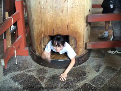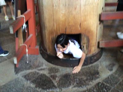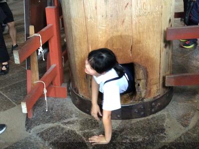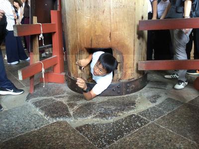 大仏殿の中にある柱に抜かれた大きな穴。穴の大きさは大仏様の鼻の穴の大きさとほぼ同じということです。31名全員がその穴くぐりにチャレンジ!見事に全員がくぐり抜けに成功しました。きっと幸運が訪れるはずです。いい思い出になりましたね。