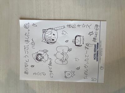 美味しい朝食を済ませ、ホテルを後にし、最も楽しみにしていた子の多いUSJに向かいました。お世話になったホテルの方々への心温まる可愛いメッセージ(画像2枚目)が、宿泊部屋から見つかりました。心配していた天気も今のところ雨の気配はなく、まずは一安心です。素敵な思い出をたくさん作ってくださいね。