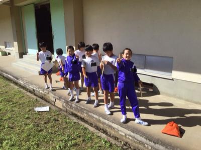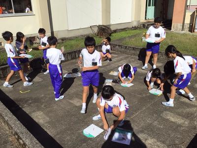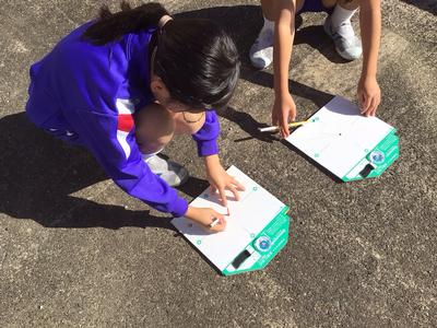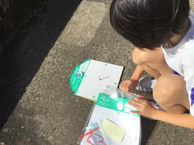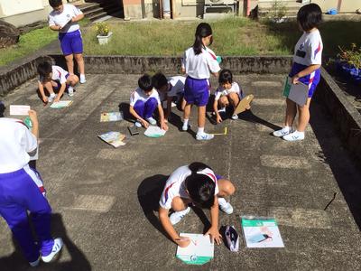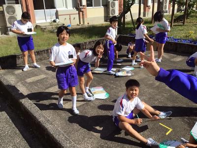 3年生は今日一日、各自が1時間ごとの影の長さと方位を記録しています。「影は太陽の反対側にできる」ことから、一日の太陽の動きを調べます。今日は影調べに絶好の秋晴れです。この後も記録を忘れないでくださいね。