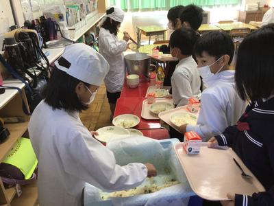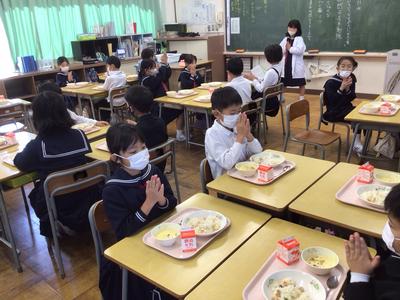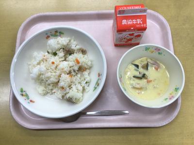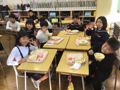 今日の献立は、チキンピラフ、パンプキンポタージュ、牛乳でした。パンプキンポタージュは秋の深まりとハロウィンを感じることのできるメニューでした。3年教室にお邪魔しました。