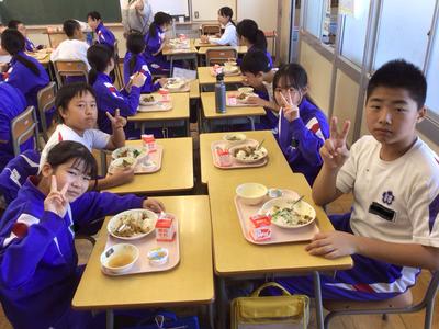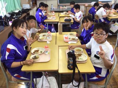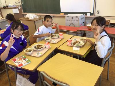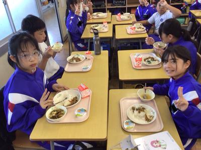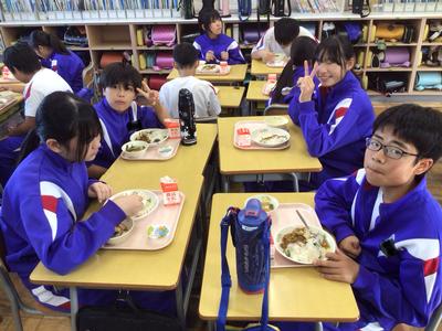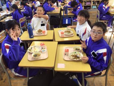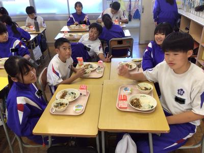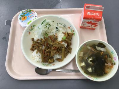 今日の献立は、秋の根菜ビビンバ、ワカメスープ、牛乳、みかんゼリーでした。6年教室にお邪魔しました。