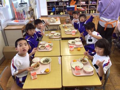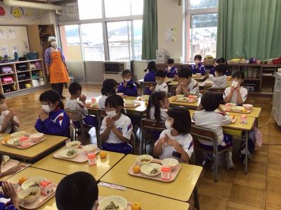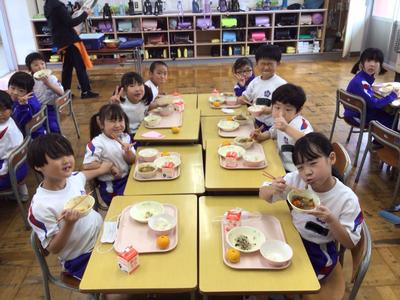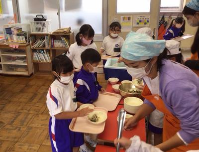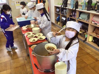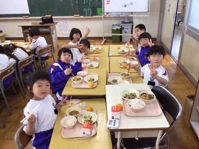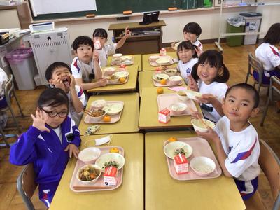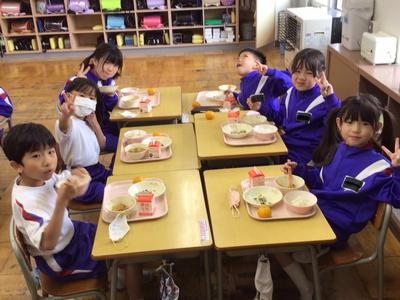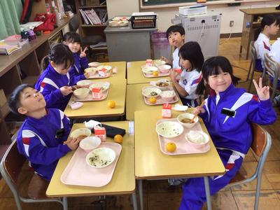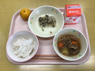 今日の献立は、麦入りご飯、肉じゃが旨煮、切干の磯香和え、牛乳、みかんでした。1年生教室の様子です。