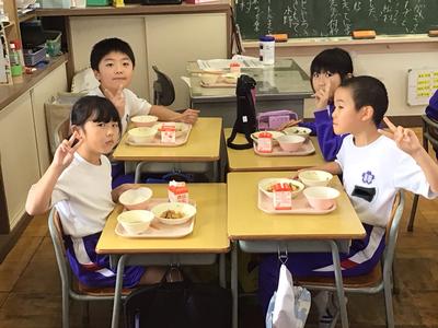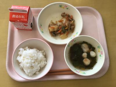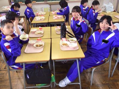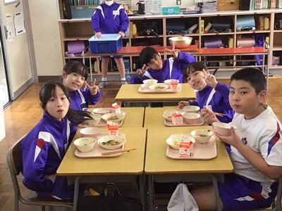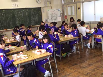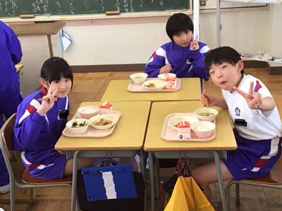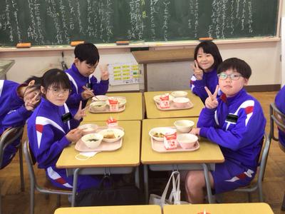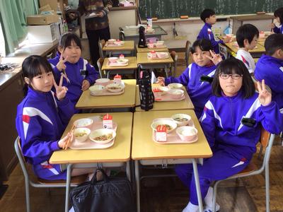 今日の献立は、ご飯、豚肉とじゃがいものきんぴら、麩としめじのすまし汁、牛乳でした。4年生教室の様子です。