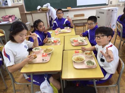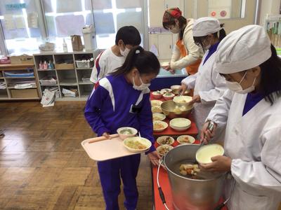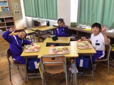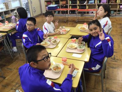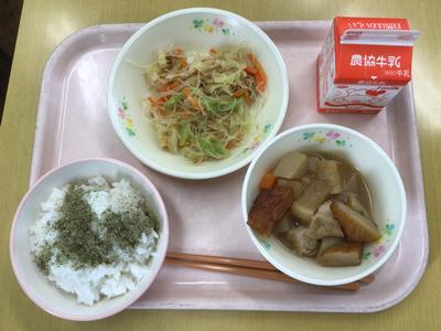 今日の献立は、ご飯、おでん、春雨のごま酢和え、手作りふりかけ、牛乳でした。おでんの美味しい季節になりました。5年生教室の様子です。