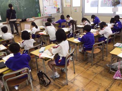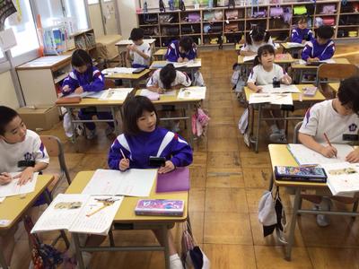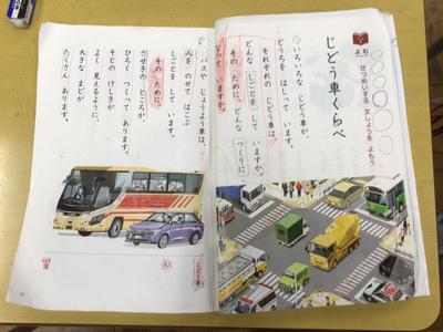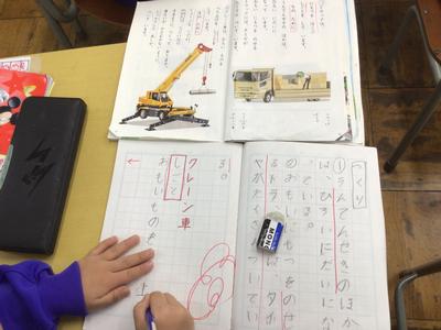 1年生の国語の授業の様子です。今日は、クレーン車について、その仕事や作りについてノートにまとめる時間でした。