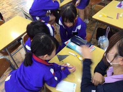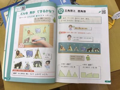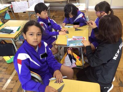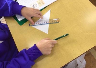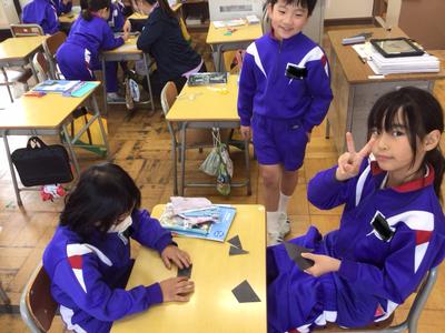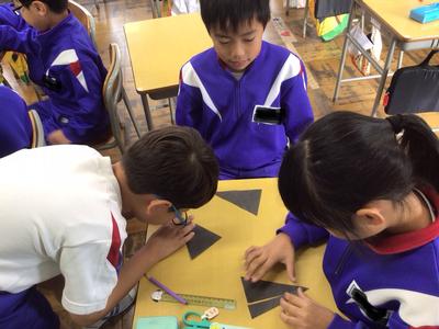 2年生の算数の授業の様子です。三角形を直線で2つに分けるとどんな形ができるか、班で話し合っていました。三角形と四角形ができた子と三角形が2つできた子がいました。