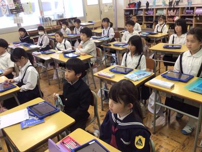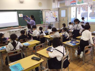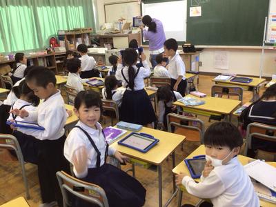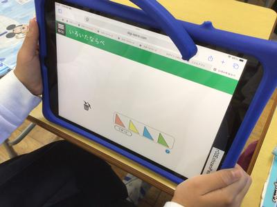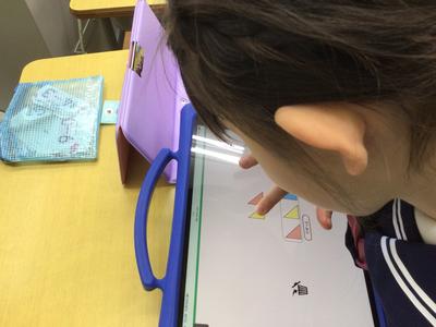 1年生の算数の授業の様子です。タブレットを使って色板ならべをしていました。どんな形ができたかな?