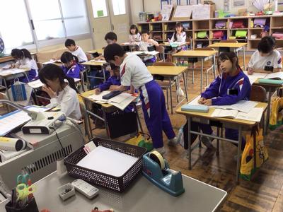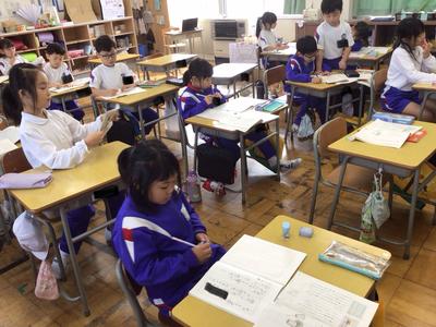 2年生の国語の授業の様子です。自分が作ったおもちゃの作り方を友達に紹介する学習です。楽しそうな学習ですね。