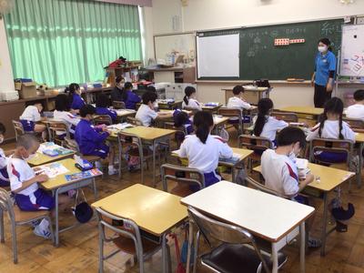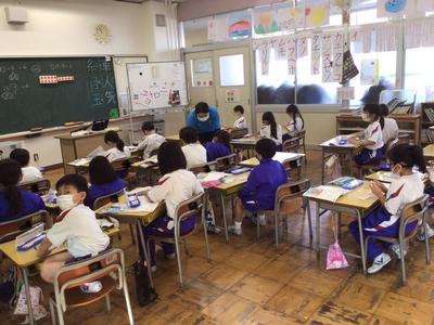 3時間目の1~5年教室の様子です。1年生 算数、2年生 生活科、3年生 図工、4年生 社会、5年生 音楽の時間でした。