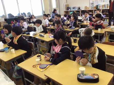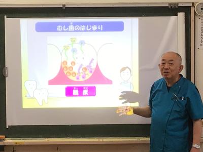 歯科健診が終わった後、4年生教室において学校歯科医さんによる歯の指導が行われました。虫歯ができる仕組みや虫歯を防ぐ方法などを聞かせていただき、その後は歯ブラシを使っての歯磨き指導を行っていただきました。歯間ブラシやデンタルフロスを実際に使っている児童が大変多くいることに驚きました。これからも歯を大切にしてくださいね。