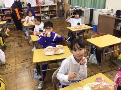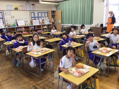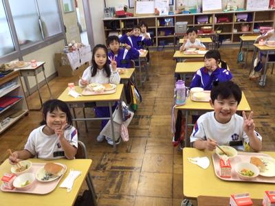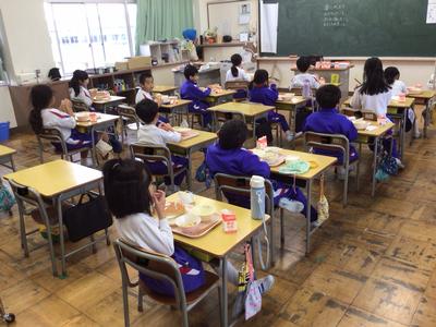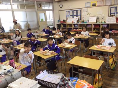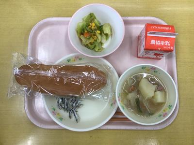 今日の献立は、パン、鶏肉とじゃがいものスープ煮、キャベツのごまサラダ、煮干し、牛乳でした。2年生教室の様子です。