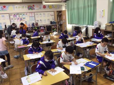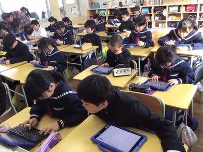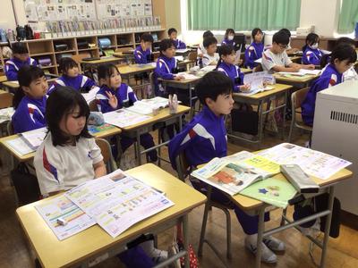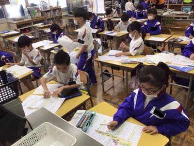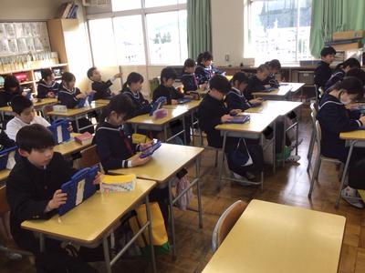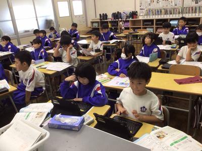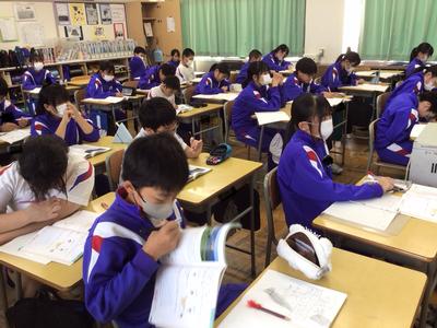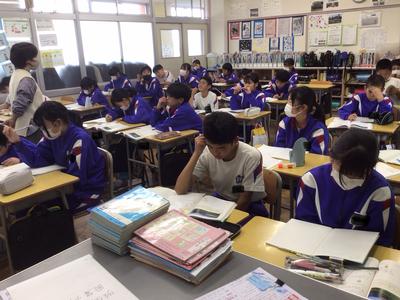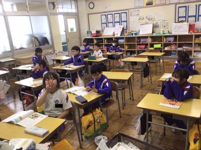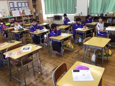 5時間目の各学年の様子です。1年生 国語(版画刷り)、2年生 道徳、3年生 理科、4年生 道徳、5年生 体育、6年生 算数の時間でした。1年生は席替えがあったようです。