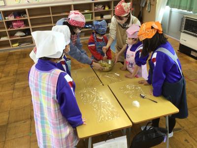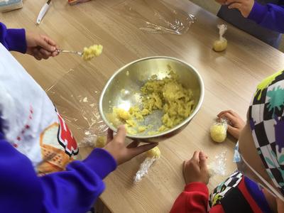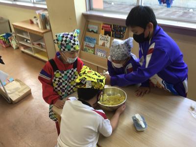 南越特別支援学校の二人のお友達が来校し、のぞみ組との交流を行いました。二人とも神山認定こども園の出身で、久しぶりの再会を懐かしんでいました。ダンスやゲームで遊んだ後、さつまいもの茶巾作りにチャレンジしました。美味しく出来上がったようです。これからも仲良く交流を続けていきましょうね。