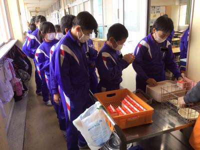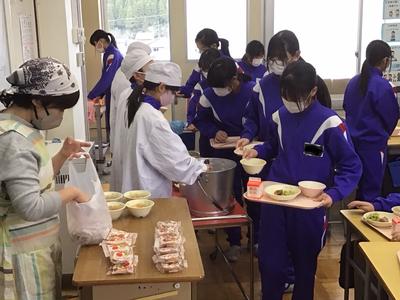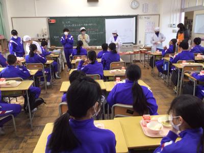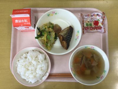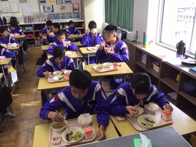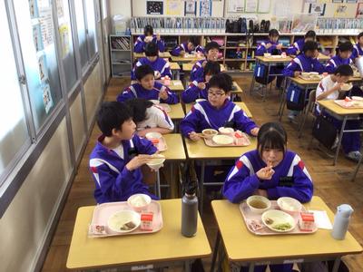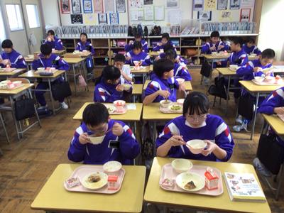 今日は調理員さんお薦め献立と銘打って、麦入りご飯、鯖の生姜煮、白菜と青菜の胡麻和え、けんちん汁、牛乳、セレクトタルト(桃・さつまいも・りんご)でした。6年生教室の様子です。