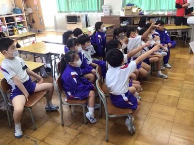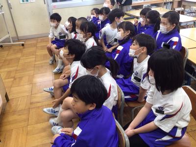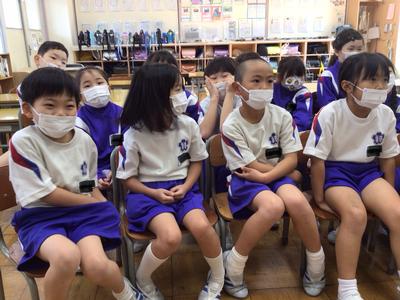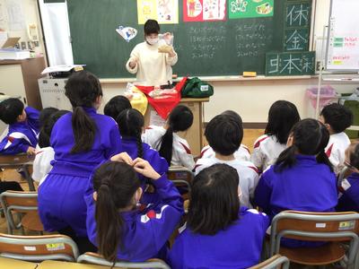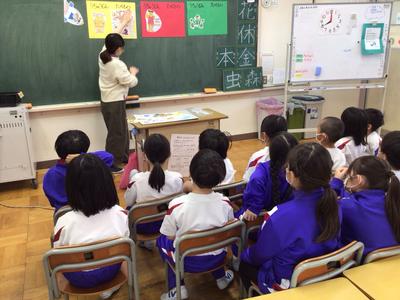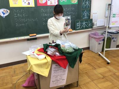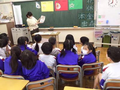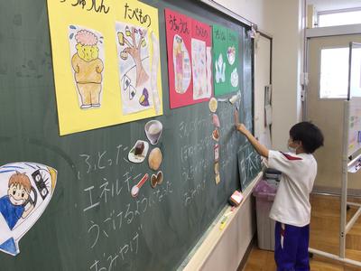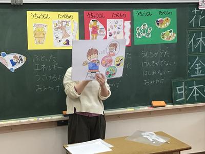 3時間目に、栄養教諭による食に関する指導が行われました。食品を黄色・赤色・緑色に仲間分けをし、その働きを学ぶことができました。紙芝居や今日の給食で用いられる食品の実物が登場し、1年生は興味深く話を聞いていました。