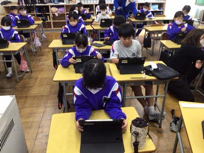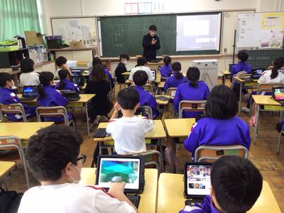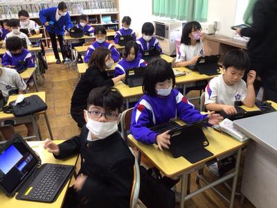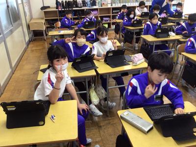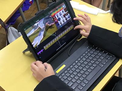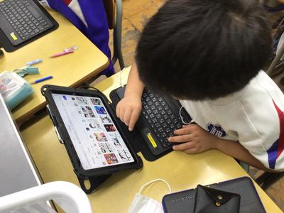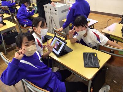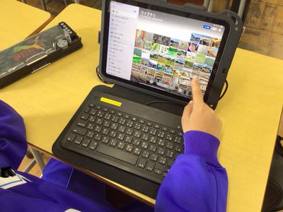 3年生がICT支援員さんのお手伝いを得ながら、タブレットを使って音や動画を編集する方法を学んでいました。15秒間のオリジナル動画が出来上がったようです。