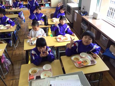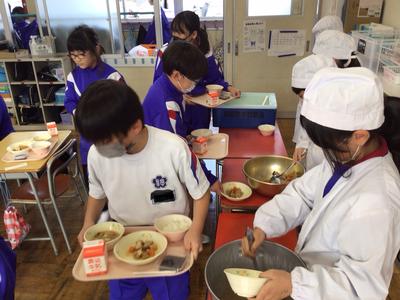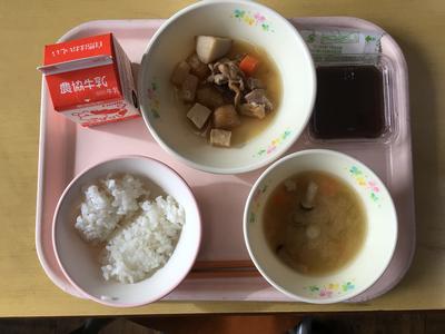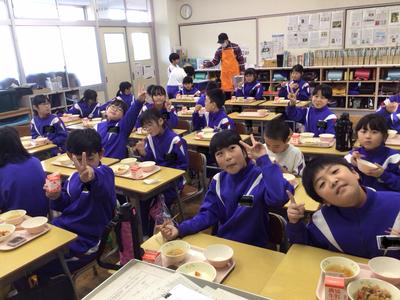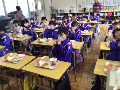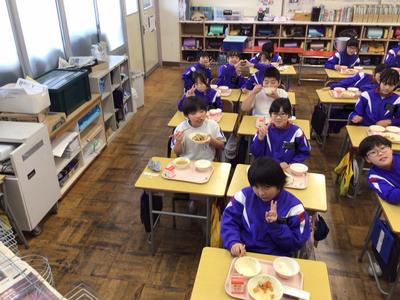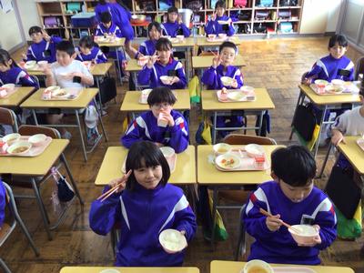 今日の献立は、ふるさと献立と銘打って、ご飯、小煮しめ、打ち豆汁、牛乳、水ようかんでした。冬にこたつで食べる水ようかんは、とても美味しいですね。4年生教室の様子です。