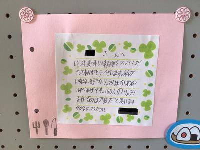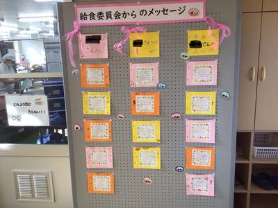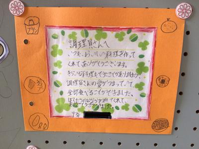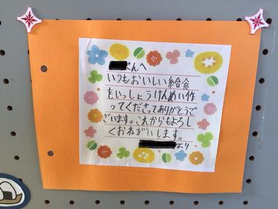給食調理員さんへの感謝の気持ちを綴ったメッセージが給食室入口に掲示されています。子どもたちはみんな給食が大好きです。これからも安全・安心で美味しい給食をよろしくお願いします。