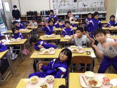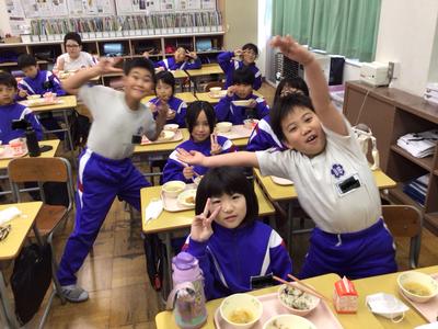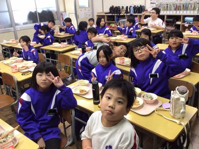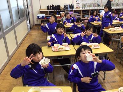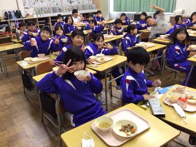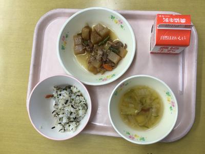 今日の献立は、ひじきご飯、大根と豚肉の醤油煮、さつまいもの味噌汁、牛乳でした。3年生教室の様子です。