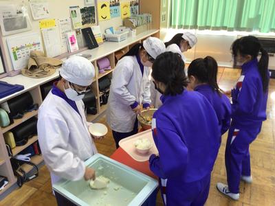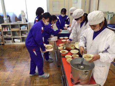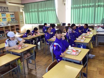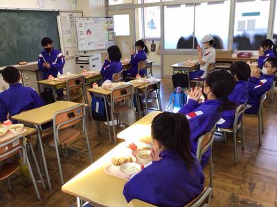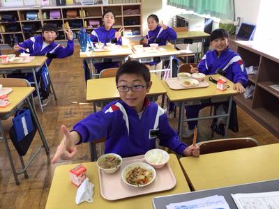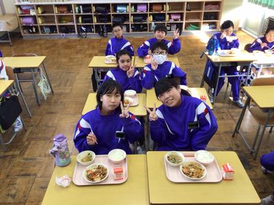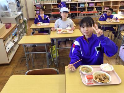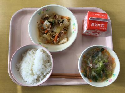 今日の献立は、ご飯、豚肉とキムチのピリ辛炒め、春雨スープ、牛乳でした。5年生教室の様子です。