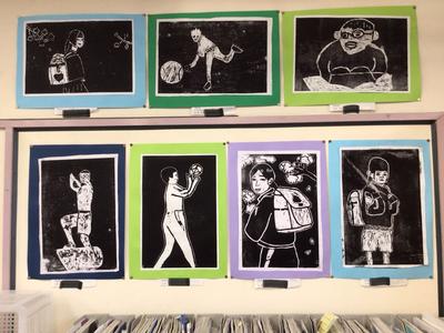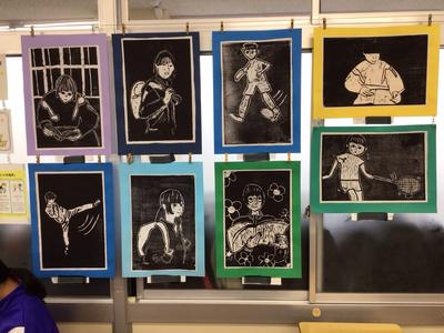 6年生の版画が刷り上がり、教室や階段踊り場に掲示されています。ここでは名前や題名を伏せてありますので、保護者会で来校された際にじっくりとご覧ください。