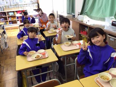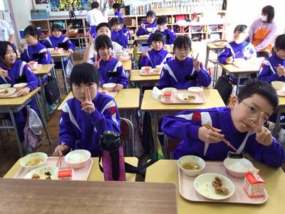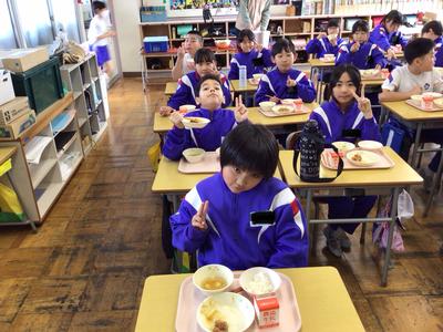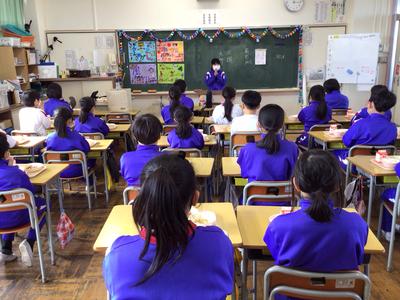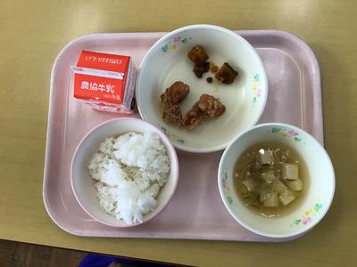 今日は省塩(塩分少なめ)・冬至献立で、ご飯、鶏肉の唐揚げ、かぼちゃのいとこ煮、豆腐とえのきのすまし汁、牛乳でした。4年生教室の様子です。