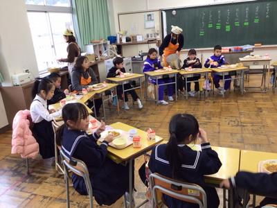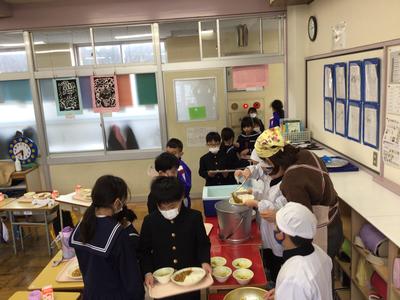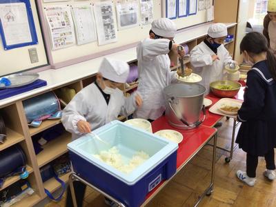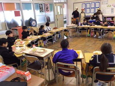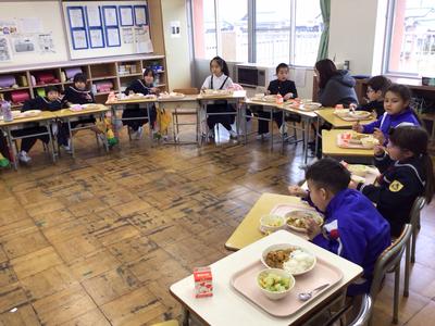 3学期初日から給食が始まりました。今日の献立は、ポークカレーライス、ドレッシングサラダ、牛乳でした。2年生教室の様子です。久しぶりの給食を美味しそうに食べていました。