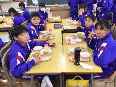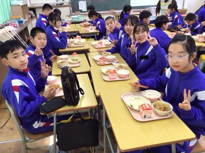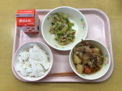 今日の献立は麦入りご飯、肉じゃが、薄揚げ入り小松菜の胡麻和え、牛乳でした。6年生教室の様子です。