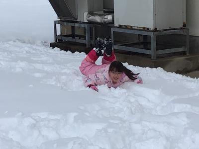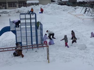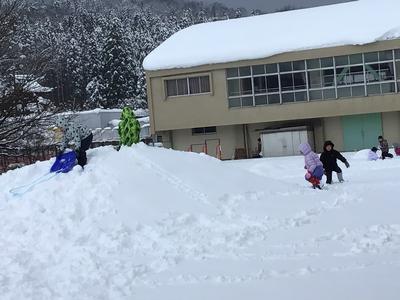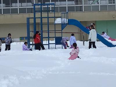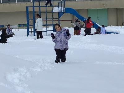 2年生が中庭に出て雪遊びに勤しんでいました。膝あたりまで積もった雪の中、元気一杯に走り回っていました。雪山に登る子やソリを楽しむ子、雪だるまを作る子など、雪国福井の子らしく思い思いに雪に親しんでいました。